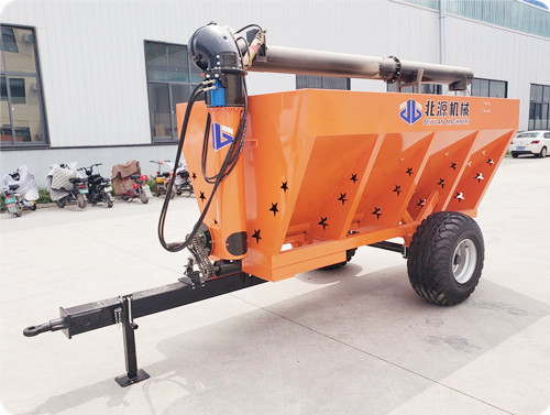 该加肥机由拖拉机后动力输出驱动工作,带动厢体内部的螺旋绞龙装置输送粮食或肥料,并通过可旋转、可提升的高炮输送管壁装置进行卸粮或加肥。